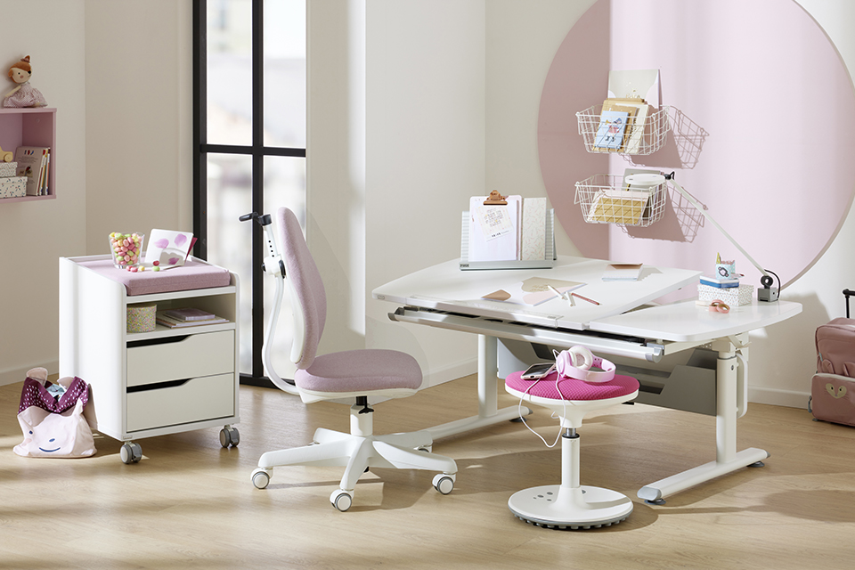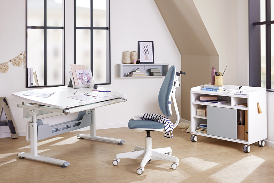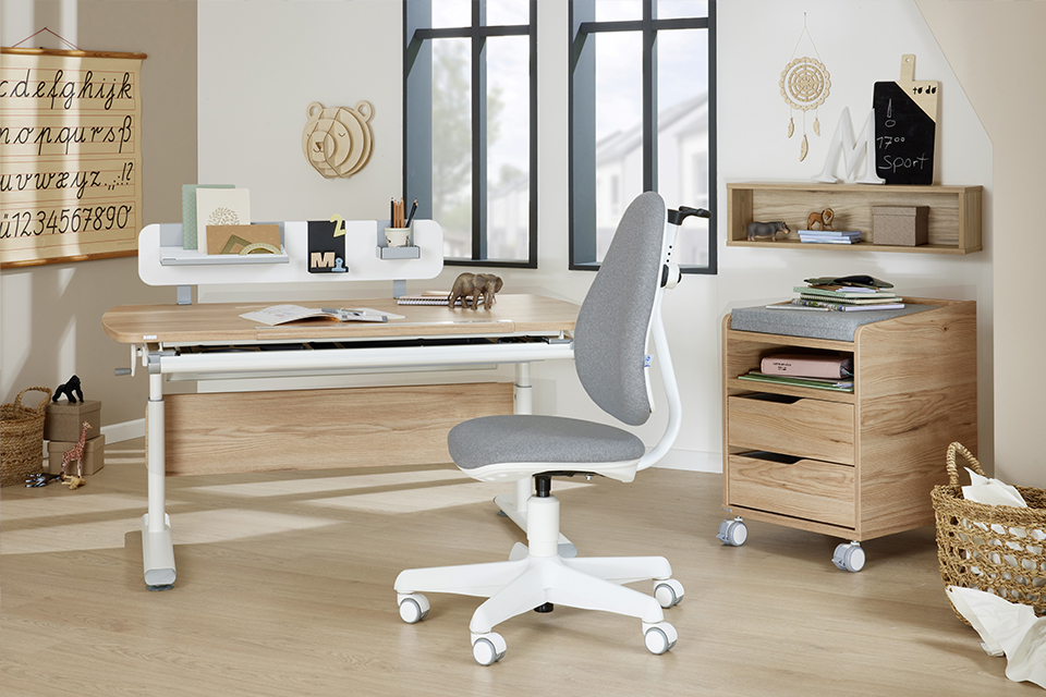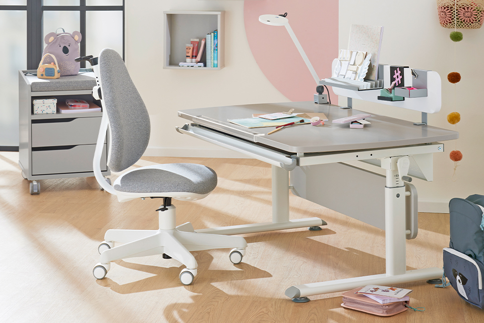 Der Schülerschreibtisch Diego ist pure Ergonomie. Die Tischhöhe stellst du stufenlos per Handkurbel auf die Größe deines Kindes ein. Die Platte ist ergonomisch neigbar, das fördert die aufrechte Haltung deines Kindes. In der integrierten Stiftmulde liegen Stifte, Lineal und Co. gut aufbewahrt, wenn du die Tischplatte für dein Kind Stifte bei schrägstellst. Diego Curved vereint Stabilität und Robustheit – für eine gesunde Arbeitsumgebung. Dir stehen zwei Ausführungen zur Auswahl: die durchgehende und die geteilte Tischplatte mit einem kleineren, feststehenden Teil und der neigbaren Hauptplatte.